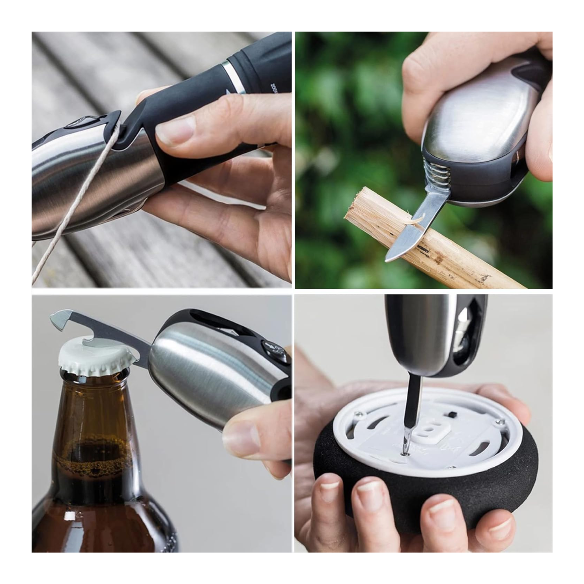 Además de su potente linterna, incorpora cuchilla, alicate, destornillador, abrebotellas, cortacables y una varilla magnética telescópica para recoger tornillos y piezas metálicas fácilmente. Todo esto en un formato compacto que cabe en tu bolsillo o mochila.